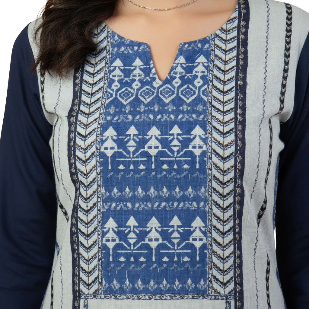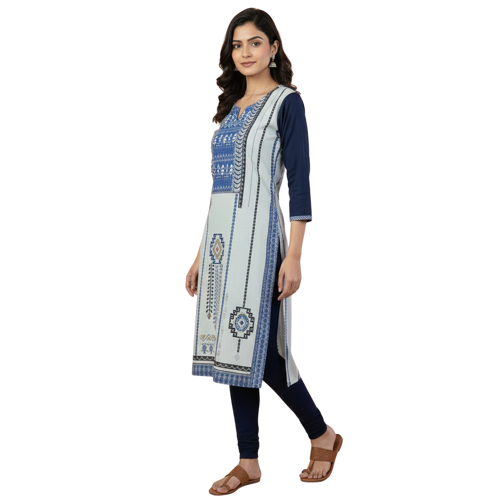 UPGRADE YOUR ETHNIC WARDROBE WITH THIS STYLISH AND ELEGANT CREPE PRINTED KURTI FROM MOON FLY. DESIGNED WITH PREMIUM QUALITY CREPE FABRIC, THIS KURTI OFFERS A SOFT, LIGHTWEIGHT, AND COMFORTABLE FEEL FOR ALL DAY WEAR. THE BEAUTIFUL ETHNIC PRINT ON THE FRONT ADDS A MODERN TRADITIONAL TOUCH, MAKING IT PERFECT FOR DAILY WEAR, OFFICE WEAR, COLLEGE, AND CASUAL OCCASIONS. THE STRAIGHT CUT DESIGN WITH THREE QUARTER SLEEVES PROVIDES A SMART AND SLIM LOOK. PAIR IT WITH LEGGINGS, PALAZZO, OR PANTS TO COMPLETE YOUR PERFECT ETHNIC LOOK.